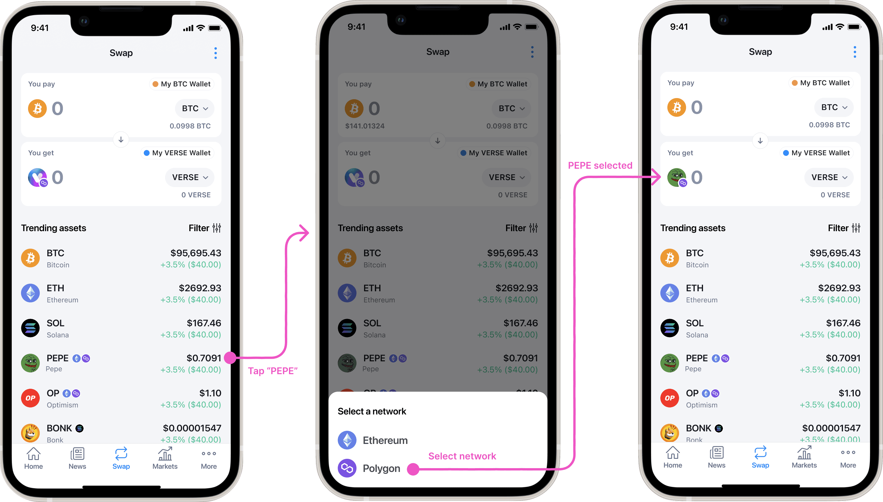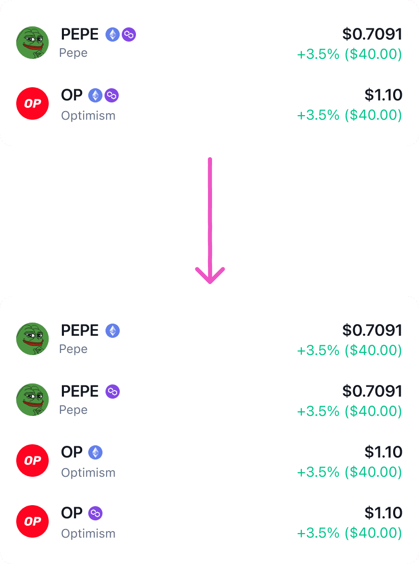 In the current app, assets available on multiple networks are grouped under one entry. When users select it, they’re asked to choose a network afterward. I proposed showing each version (per network) separately upfront, so users don’t have to make that decision mid-flow. It simplifies the experience and removes an extra step.