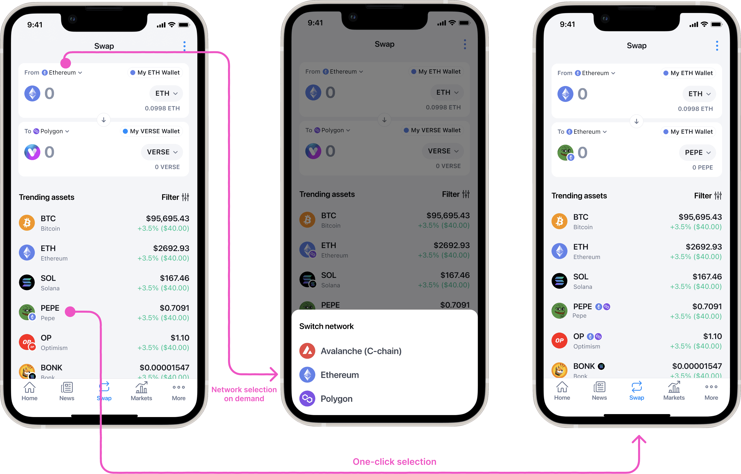 When users interacted with assets available on multiple networks, they were forced to choose a preferred network every time, adding friction to an already complex flow. I explored three design directions to reduce this decision fatigue.